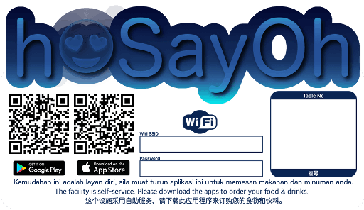 For self-service food court or hawker center, download and print the sticker and paste it on every table. The sticker provide the QR code download link of the HoSayoH app that is used to browse the menu, placing the order and request for table.